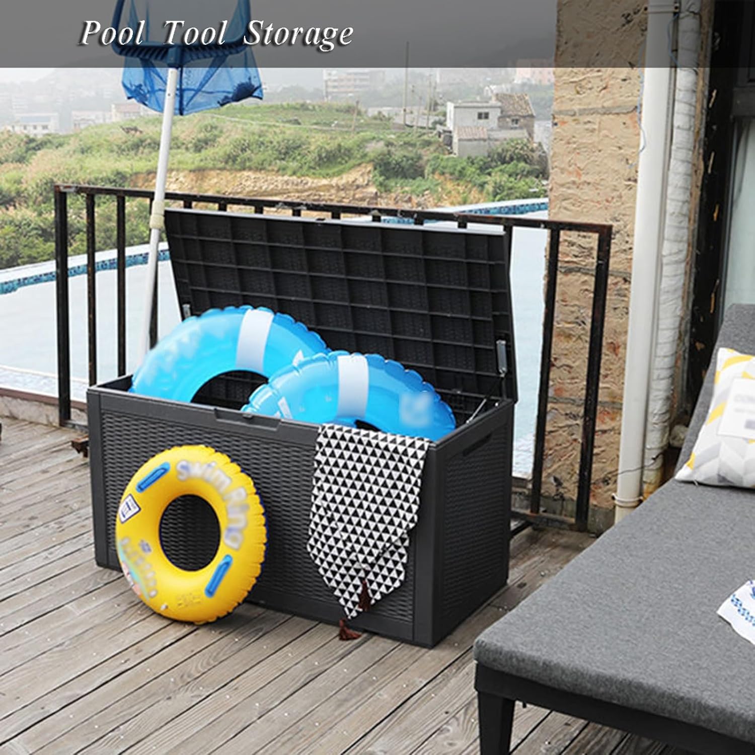 Keep your outdoor indoor space organized with 110 Gallon Waterproof Resin Deck BoxOur storage container provides you with a simple and efficient way to save space in your home, for storing patio furniture cushions, garden tools, sport equipments,and your family souvenir. Also, it can be used as a bench, with its stylish design, it can be a great decoration for your outdoor life. Deck box outdoor storage box large outside storage waterproof storage boxFeatures:-Stylish rattan pattern design suit for your deck, garden, yard, porch and poolside-Waterproof poly resin meterial prevent fading, rusting, peeling and bending-Lockable lid keeps your belongings safe and secure-Side handle on both side for easy and comfortable moving arround.-KD design, easy to clean and assemblyDimensions: 48" x 21.4"W x24.5" Storage capacity: 110 GallonMeterial: Resin & Steel