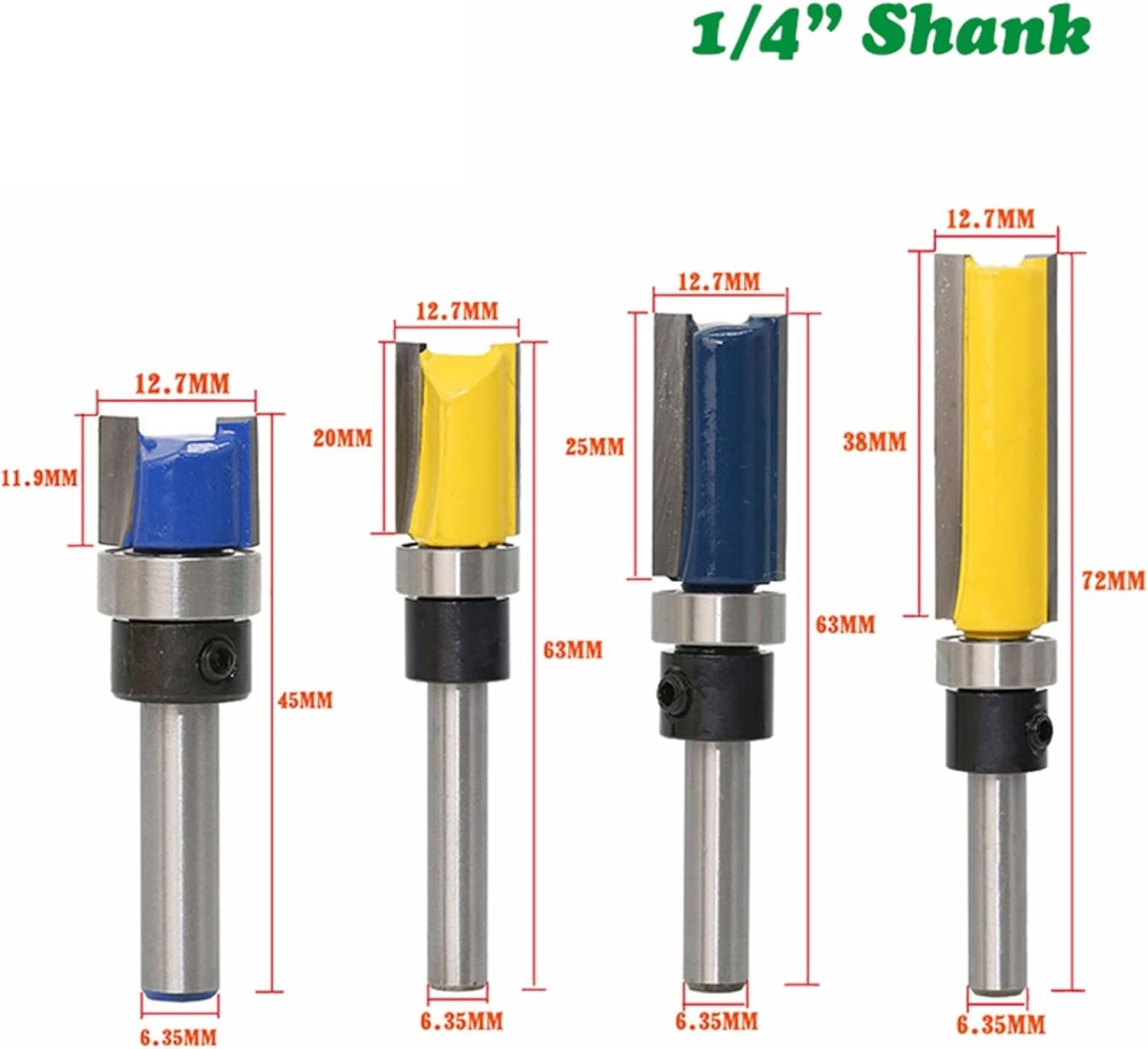 Features: Using for hand making a drawer or other woodworking. Industrial quality router bits . Solid hardened steel bodies with anti kickback design. Build-up & heat resistant Teflon coating. Hook & Shear Angles: High hook & shear angles allow Cutters to slice smoothly into stock producing clean, splinter free. Bearing: Totally enclosed & lubricated. Specifications: Item: 1/4" Shank Pattern BitsMaterial: 45# steelCarbide tip: YG6XShank Diameter: 1/4Tip Diameter: 12.7mmBalance: +/- .003" tolerance Body: Solid Hardened Steel Blade: Industrial grade micro grain carbide Cutter: CNC ground to a 600 grit, mirror-like finish Package include:4 x Pattern BitsNote: Color that you placed will be first choice to delivery. But if it is out of stock, other colors will be replaced. Please read this note as carefully as you can when you place an order. Please allow 1-3mm differs due to manual measurement. Due to the different display and different light, the picture may not reflect the actual color of the item. Thanks for your understanding.