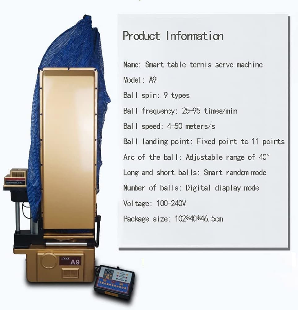 Features:Straight ball, top spin, down spin, left spin, left up, left down, right spin, right up, right down all kinds of spin. Adjustable speed, arc of the ball, drop point, rotation, can quickly improve the level.Specifications:Product name: table tennis ball machineNine different spins (top spin, left top spin, left spin, left bottom, bottom spin, right bottom right spin, right top spin, no spin ball)Ball frequency: 25-95 times/minuteBall speed: 4-50 meters per secondPlacement of the ball: from the fixed point to 11 points in TaiwanRadius of the ball: adjustable range 40 degreesLong and short balls: Smart random modeNumber of shots: digital display modeGross weight: 17.4 kg; net weight: 13.4 kgPacking volume: 102*40*46.5 cmPacking List1x Ball net1x Controller1x User manual1x Power supply1x Ping pong robotNote:Please allow 1-3cm (0.4-1.18") difference due to manual measurement and slight color variation for different display setting.