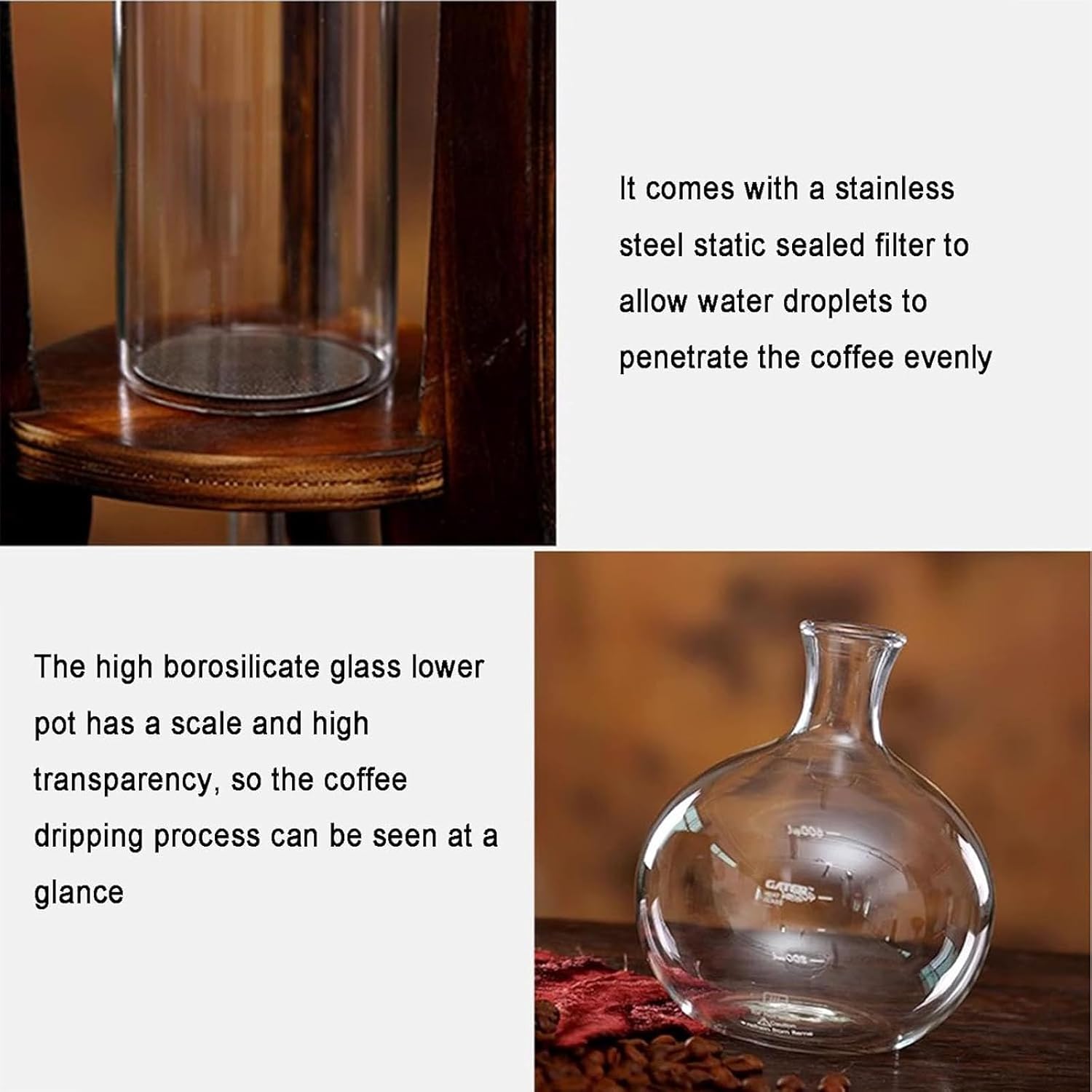 Specifications: Name: Cold Brew Coffee Maker Material: glass, wood Capacity: 600ml, 1000ml Product includes: 1pc * Cold Brew Coffee Maker