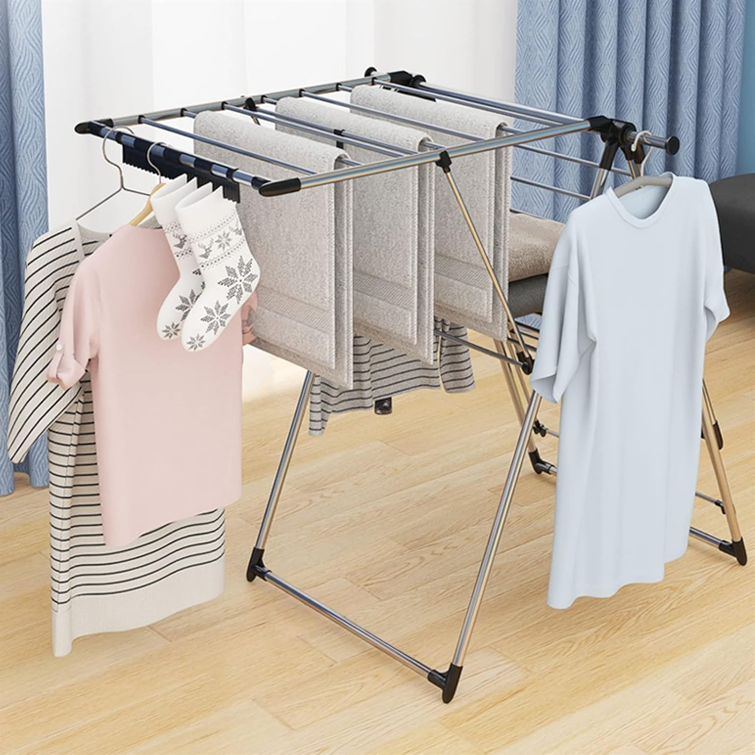 Product name: Folding Hanger Hint: 1. Please check the size before purchasing. Due to manual measurement, there will be a 0-5cm error. 2. Excludes items other than the product shown in the product photo. 3. Please note that due to different monitors, there may be slight color differences, please understand. 4. The above data is for reference only, the size is measured manually, each variable may be different, please refer to the actual product, thank you. Each drying rack can be folded to save space and you can dry clothes in multiple places.