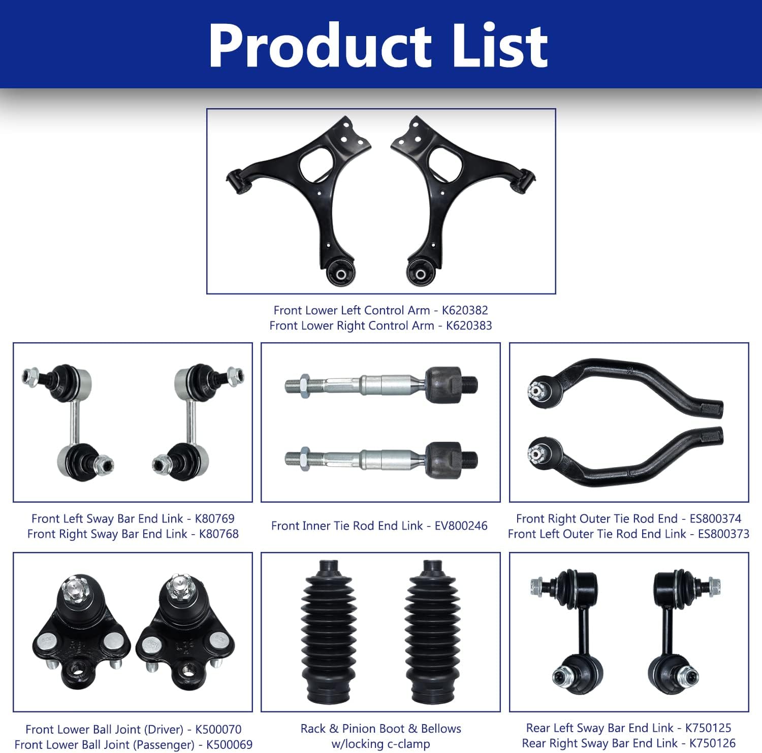 | Included Components | boot, control arm, sway bar, tie rod |