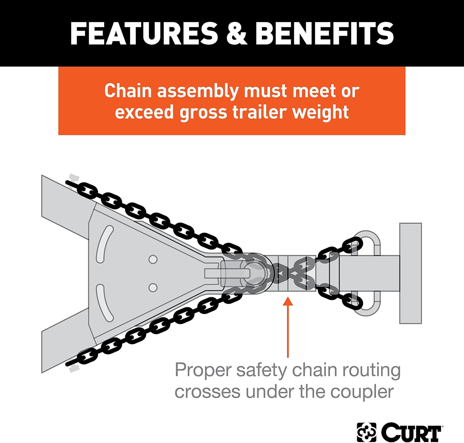 No matter how far you are planning to drive -- down the street or across the state -- using safety chains when you tow is smart, safe and required by law. Without safety chains attached, there is a serious risk of danger if your trailer becomes uncoupled from your trailer hitch. Play it safe with safety chains, and play it even safer with safety chains from CURT. CURT has a few different options when it comes to securing your trailer. This heavy-duty safety chain is made from high-quality steel and is grade-43 certified. It is equipped with a single, sturdy safety latch clevis hook for reliable coupling to your vehicle, even over rough terrain, and features a minimum break force of 11,700 lbs. Remember, each safety chain assembly connecting your trailer to your vehicle must meet or exceed the gross trailer weight. This CURT safety chain measures a total length of 32" and has chain links with a 5/16" diameter. In our book, making safety a priority when you tow is a must. We offer all the safety equipment needed for successful towing, from our electrical components to our safety chains. The next time you hitch up for an adventure, always Bring It safely with CURT.