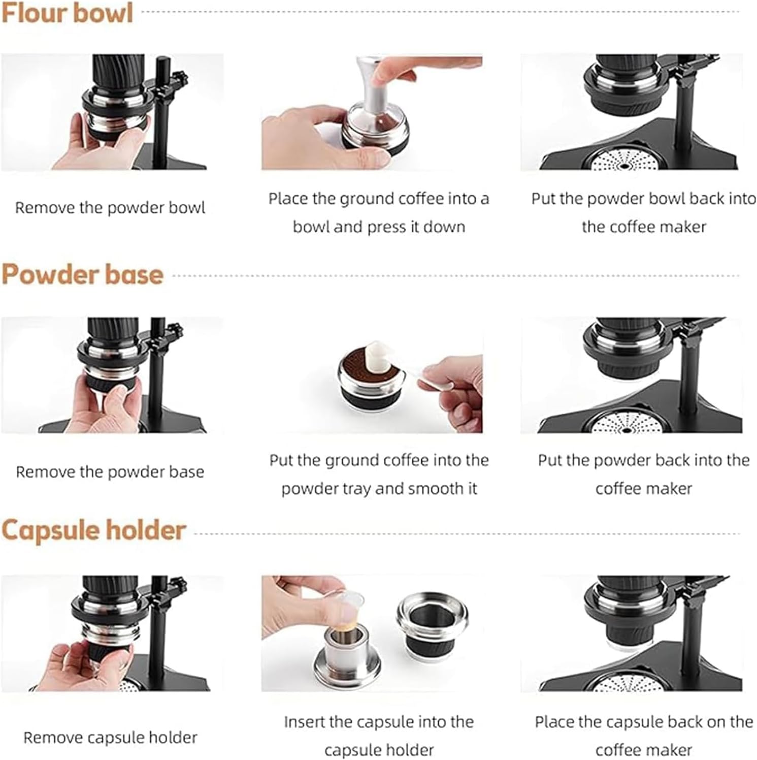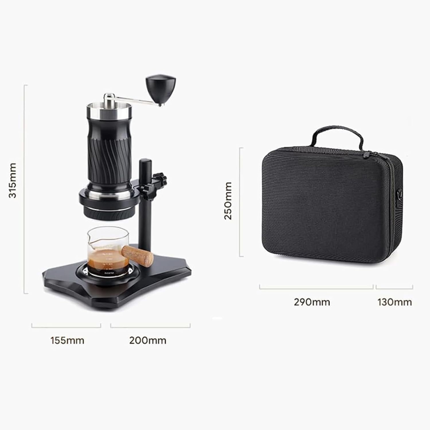 Specifications: Product Name: Hand-cranked Espresso Machine Color: Black Water Tank Capacity: 100ml Material: PP, SUS304, Silicone Product Dimensions: 200*155*315mm Portable Bag Dimensions: 290*250*130mm Packaging Dimensions: 47*32*30cm Gross Weight: 3.7kg Packaging Includes: Hand-cranked Espresso Machine Set * 1