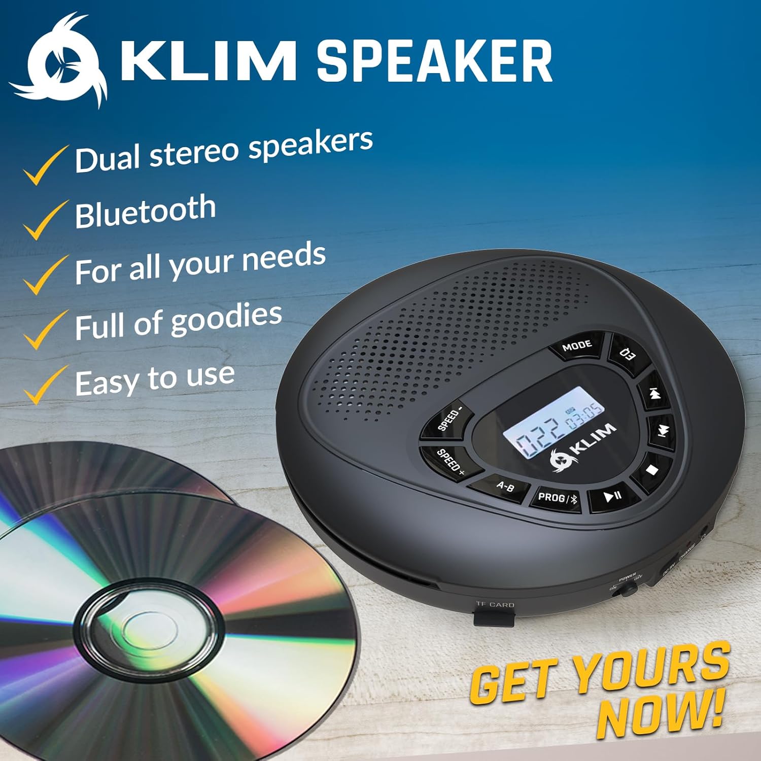 BUILT-IN SPEAKERS + BLUETOOTH + AUX + SD/TF CARD READER + EARPHONES: This discman cd player is packed with connectivity features. Play tracks through the built-in dual stereo speakers or for better sound quality use the included earphones, directly from a CD or a TF card up to 32 GB. It's also an excellent portable cd player for car using the included AUX cable.