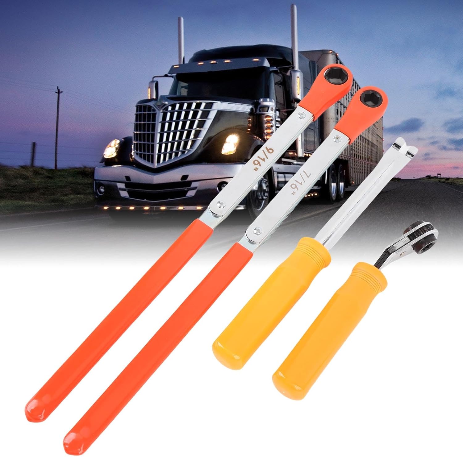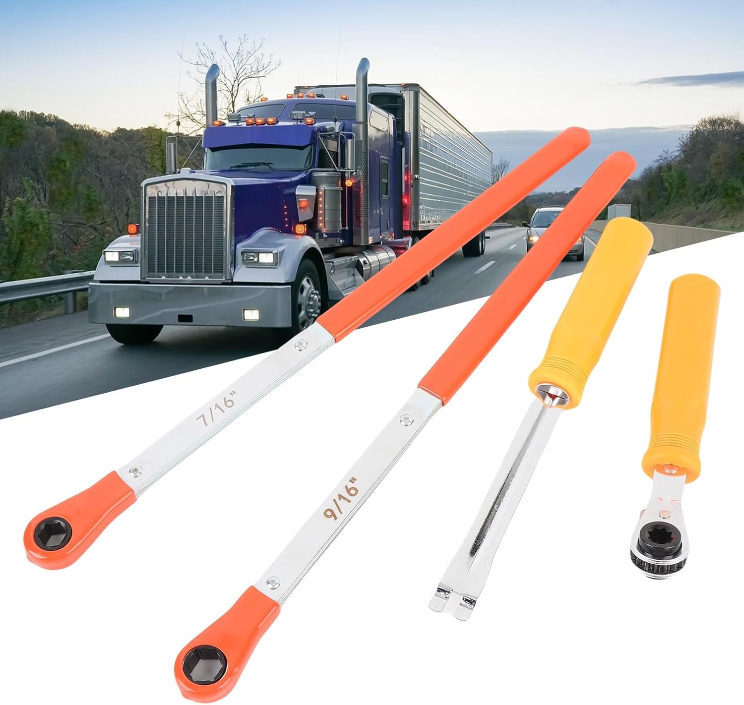 [Ease of Use] The fork end release tool is specifically designed to release the tensioner button, providing significant ease when making necessary adjustments to the braking system for smooth operation. [Quick Direction Changes] Featuring a ratcheting mechanism, the slack adjuster wrench allows for quick direction changes without removing the wrench from the adjuster for hassle>-k>k> adjustments. [Portable and Convenient] This slack adjuster tool set is an excellent companion for heavy duty truck and trailer drivers, increasing efficiency and helping complete tasks more effectively. the included storage bag ensures easy portability for on-the-go use. [Sturdy and Comfortable] Crafted from robust metal materials, the slack adjuster tool and wrench ensure long-lasting durability. the rubber handle provides a comfortable grip during use, enhancing overall functionality. [Efficient Brake System Maintenance] The slack adjuster wrench tool set streamlines air brake system installations in heavy duty trucks and trailers. make brake repairs easier and more efficient. Spec: Item Type: Slack Adjuster Wrench Kit Material: Metal Wrench Size: 7/16in, 9/16in, 5/16in Application: Brake adjustment on heavy duty trucks Package List: 1 x Slack Adjuster Wrench Kit (4Pcs)1 x Storage Bag