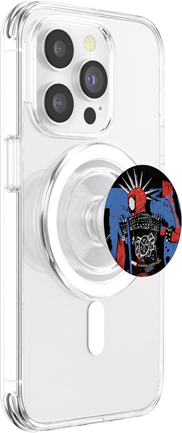 Spider-Man merchandise design. Welcome to an infinite multiverse of spider-heroes! Bring some wild web-slinging anarchy to your phone with this official Marvel attachable grip for mobile devices, featuring senses-shattering iconic art of Hobie Brown, the anarchic Spider-Punk from another universe, turned to show his iconic spiked mohawk and the “FNSM” (for “Friendly Neighborhood Spider-Man”) Spider-symbol on his back in a frenzied underground punk rock style. Stick the pop up grip to the back of your phone or tablet and use it as a handle for taking selfies or as a stand for watching videos. A great gift for a Spider-Man, Spider-Punk, or Marvel fan!