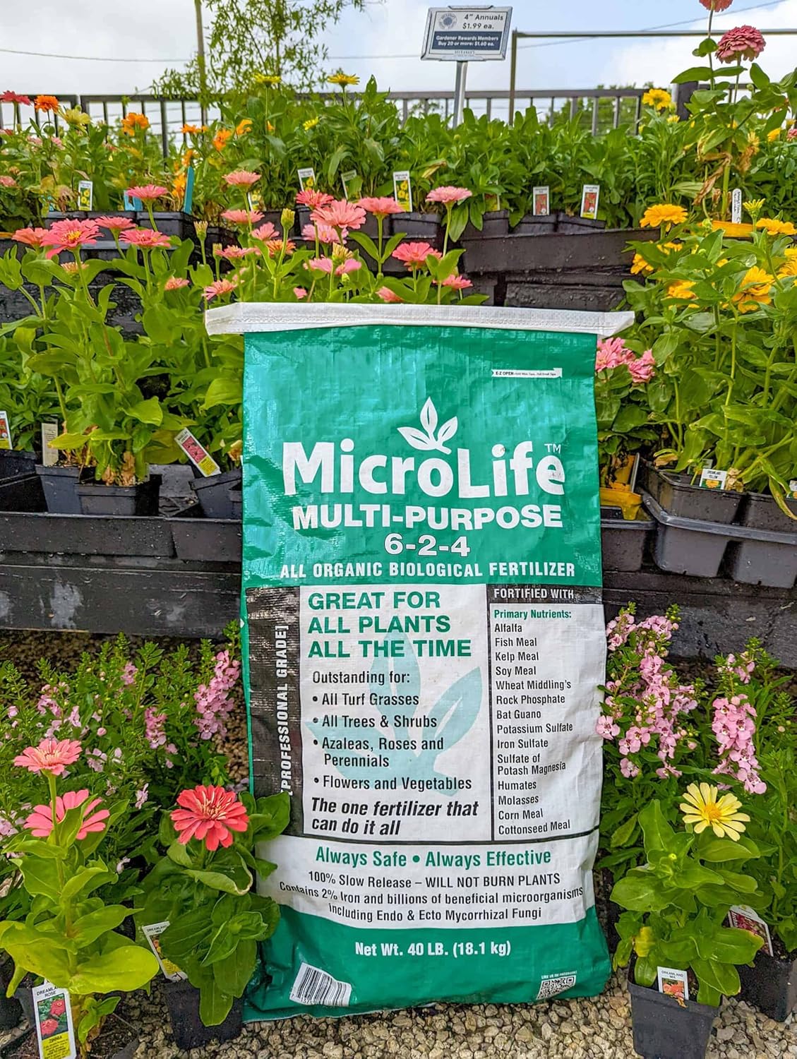 Extremely powerful, homogenous, granulated All Organic Biological fertilizer containing: Fish, Kelp, Molasses, Emery Humates, Rock Phosphate,Wheat Middling’s, Soy Meal, Cottonseed Meal,Alfalfa, Corn Meal, Kmag, Potassium Sulfate, Iron Sulfate, 18 select Amino Acids, Folic Acid,Vitamins, plus the MicroGro Supreme Bio-Inoculant package which contains billions of beneficial microorganisms including Endo & Ecto Mycorrhizal. All ingredients are included in meaningful amounts. Improves all soils by feeding the indigenous microbes, adding billions more, by providing specific soil improvers like polysaccharides, humic acid, fulvic acid and the major building blocks of life. MicroLife 6-2-4 builds big root systems which further improves the soil and reduces water use. Rates: Turfgrass: 15 – 20 lb per 1,000 sq ft. Repeat every 3 – 4 months Ornamentals, Flowers,Veggies & Fruit: 20 – 40 lb per 1,000 sq ft. Repeat every 3 – 4 months Building Beds and Gardens: 40 lb per 1,000 sq ft worked into the soil Tree installations & Containers: 2.5 oz per 5 gal size. Repeat every 3 – 4 months
