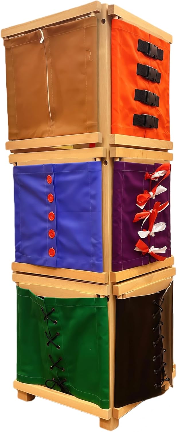 The First Steps to Independence: A Complete, Child-Sized Dressing Frames Station Also known as: Montessori toddler dressing frames, practical life cabinet set, fine motor skills learning tower, preschool self-help toys, occupational therapy tools for kids, wooden dressing practice set, kids wardrobe skill toy, homeschooling practical life materials. Introduce the wonder of “I did it myself!” with our specially curated 6-Frame Dressing Set with Integrated Storage Cabinet. Designed for the sensitive period of order and movement in early childhood, this all-in-one learning station empowers children ages 3 and up to master foundational life skills through beautiful, accessible, and success-oriented materials. · Premium, Child-Safe Construction You Can Trust · Material: Frames and cabinet crafted from solid, sustainable beechwood with a smooth, non-toxic finish. · Safety First: All edges are meticulously rounded. The set is recommended for children 3 years and older and complies with rigorous safety standards for educational toys. · Dimensions & Weight: Each frame: 30x30x3cm (11.8”x11.8”x1.2”), 0.35kg (0.77 lbs). Cabinet: 35x35x32cm (13.8”x13.8”x12.6”). Total packaged set weight: 4.35kg (9.6 lbs)—sturdy yet manageable for educators and parents. · The Revolutionary Standing Cabinet: Fosters Autonomy & Order The included cabinet is central to theMontessori philosophy of a “prepared environment.” · Fosters Independence: Children can select, carry, and return frames to their designated slots without adult assistance, fostering autonomy and decision-making. · Teaches Order & Responsibility: The organized presentation visually reinforces the concepts of sequence, care for materials, and completion of a work cycle. · Optimizes Space: The compact, upright design (35x35x32cm) keeps six complete activities neatly organized, perfect for homeschool shelves, classroom corners, or playroom storage. · Six Foundational Skills for Early Childhood Mastery This set is a carefully sequenced curriculum for young children,progressing from simplest to most complex: 1. Double Velcro Frames: Two variations (including a cute felt design) to master the easiest fastener, building initial confidence and repetition. 2. 3-Button Frame: Features large, toddler-friendly buttons on a charming fabric background for first buttoning practice. 3. Large Zipper Frame: A chunky, easy-grip zipper with a fun pull-tab for successful opening and closing motions. 4. Snap Frame: A satisfying, sturdy press-snap fastener that develops isolated finger strength. 5. Buckle Frame: A simple yet engaging clasp buckle for practicing alignment, threading, and closure. · Designed for Success and Joyful Learning · Progressive Difficulty: Skills are intuitively sequenced from very easy (Velcro) to moderately challenging (Buckle), ensuring a gradient of success that maintains motivation. · Engaging Visuals: The cute animal, vehicle, or shape fabrics make each frame inviting and relatable, transforming repetitive practice into playful engagement and storytelling. · Real Skill Transfer: The mechanics and sizing are authentically scaled for little hands, ensuring skills learned here directly and successfully apply to your child’s own clothing, shoes, and bags. · Why This Set is an Essential Teaching Tool · For Parents & Homeschoolers: Creates a calm, focused activity that develops patience, perseverance, and pride. Dr. Maria Montessori said, “The greatest gifts we can give our children are the roots of responsibility and the wings of independence.” This set provides both. · For Preschools & Daycares: A durable, all-in-one solution that supports multiple children in learning essential self-care routines, reducing transition times and fostering peer learning. · For Early Childhood Educators: Embodies the Montessori principles of auto-education, control of error, and development of the will through purposeful work. · The Gift of Capability and Confidence This is more than a toy;it’s an investment in your child’s future independence. As a birthday gift, Christmas present, or kindergarten readiness gift, it sends a powerful message of belief in a child’s capabilities. Parents and grandparents will appreciate the thoughtful design, exceptional quality, and lasting educational value. · Inclusive by Design: Benefits Extend Beyond Early Childhood The clear,isolated difficulty and highly tactile nature of these frames make them versatile tools for diverse learners: · Special Needs Education: Excellent for children with developmental delays, autism, or those needing occupational therapy (OT) to build fine motor skills, focus, and sequencing abilities in a structured, predictable, and low-pressure way. · Intergenerational & Senior Care: The manageable, familiar frames serve as wonderful cognitive and fine motor activities for seniors or individuals in memory care, helping maintain dexterity, hand-eye coordination, and providing a tangible sense of accomplishment and purpose. Order Today and provide the beautiful, organized tools that guide your child’s first triumphant steps toward lifelong independence.
