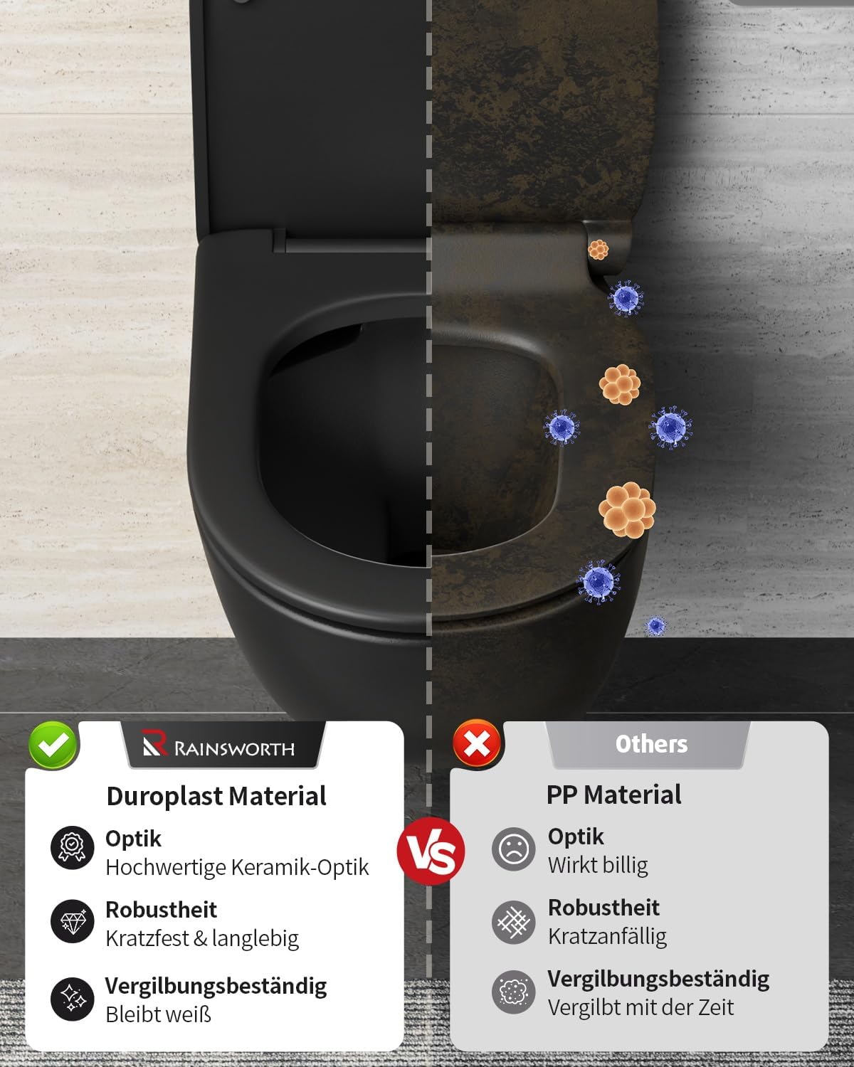 Discover the wall-mounted Rainsworth toilet – the perfect combination of powerful performance, elegant design and intelligent comfort for your modern bathroom. This complete set is designed to revolutionize your daily routine and give you maximum hygiene, peace and space efficiency Key benefits at a glance: -360° turbo flushing: no more residue or laborious scrubbing -Soft closing mechanism: silent closing for a peaceful household -High quality material and quick closure: durable and quick to clean -Space-saving design: ideal for small baths. Maximum flexibility. Installation: complete set, compatible with standard front wall elements