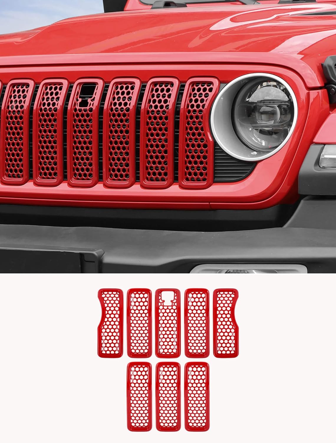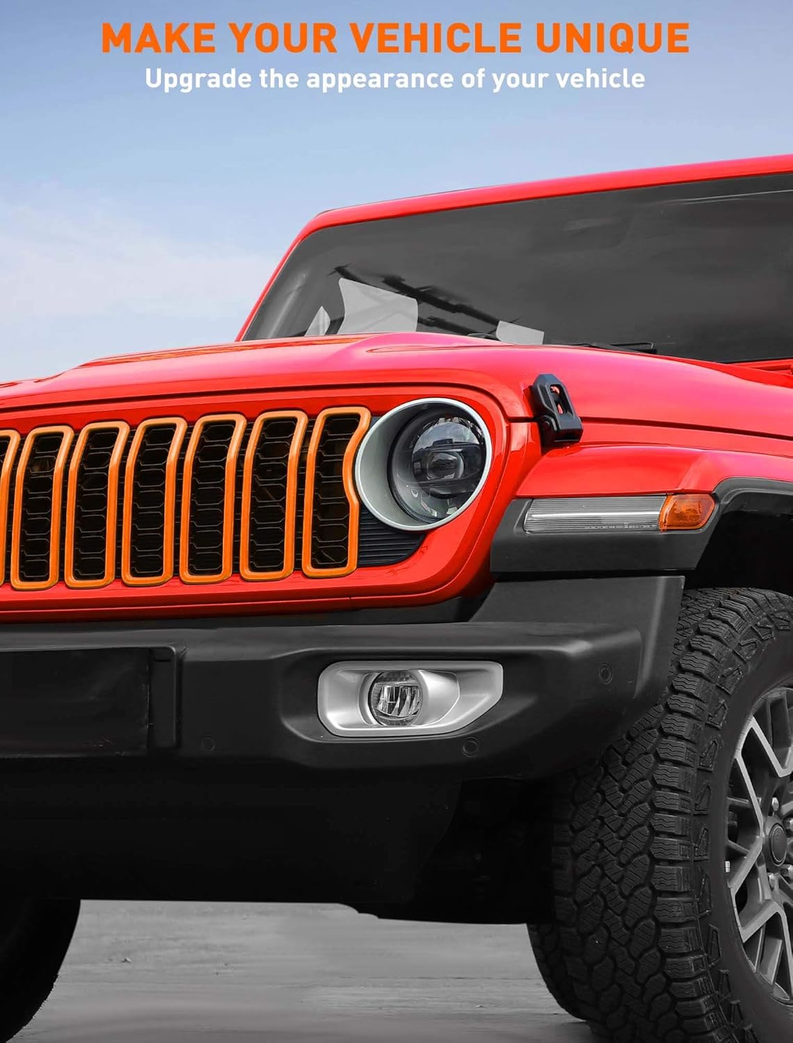 Please Note:This grille overlay is exclusively designed for the standard new grille of 2024+ Jeep Wrangler and Gladiator models. It is not compatible with the optional Performance Satin-Black Grille.An excellent choice for upgrading your front-end appearanceTransform the look of your vehicle effortlessly with our top-rated Grille Insert Section. It's an excellent choice for upgrading your front-end appearance, adding a touch of sophistication and more aggressive to your ride. Crafted with precision, our grille bezel cover is designed to seamlessly blend with your vehicle's contours, offering a perfect fit and an enhanced visual appeal. Exquisite craftsmanship ensures lasting durability and qualityElevate your vehicle's durability with our Grille Insert Section, engineered with a robust ABS structure. ABS, renowned for its exceptional sturdiness, combines lightweight properties with superior durability and impact resistance. Our grille insert goes a step further by featuring an added layer of optically solidifying gel on the ABS surface, providing an additional shield against the elements. This protective coating ensures your grille stands up to sunlight, rain, mud, dirt, oil, and other potential corrosives, keeping your vehicle's appearance pristine and unblemished. Choose our Grille Insert for a blend of strength, protection, and styleFeature:- Grille Inserts- Gloss Orange Finish- Durable ABS Plastic Construction- Automotive double-sided tape installation- Not Compatible with Performance Satin-Black Grille- Fits 2024 Jeep Wrangler JL JLU 4xe and gladiator OnlyPackage Include:7 PCs Savadicar Gloss Orange Grille Insert Cover