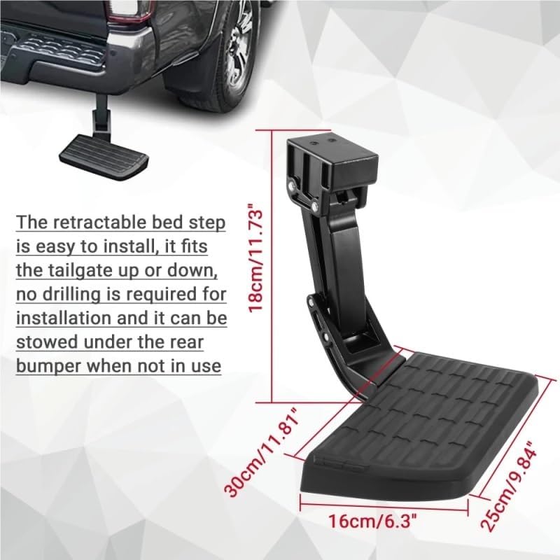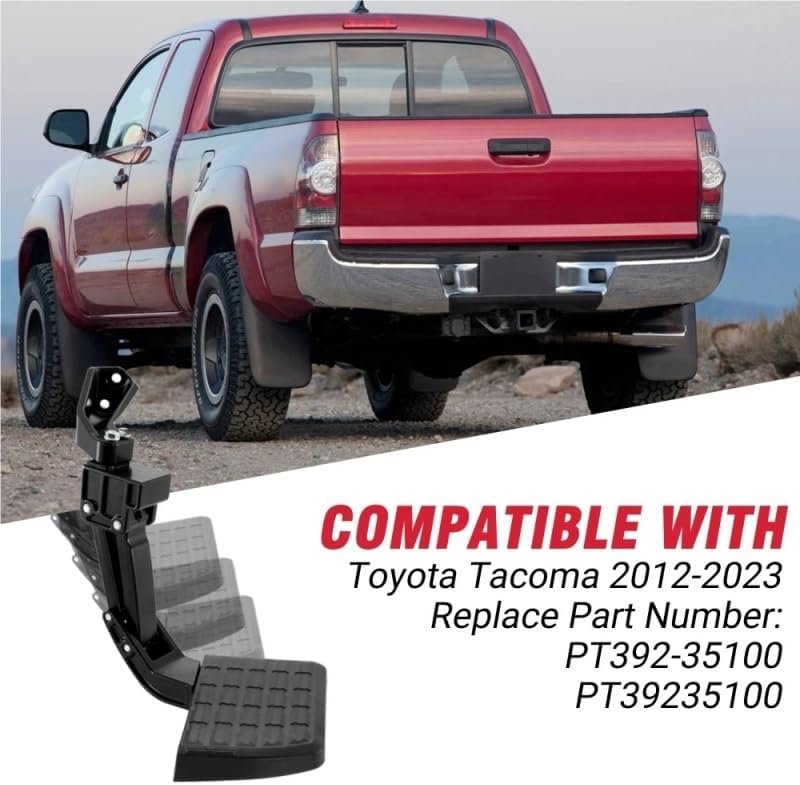 Suitable forFitment:Fit for Toyota Tacoma 2012-2022Features:* Made of high-strength aluminum alloy material, with diamond-shaped pattern on the surface, excellent anti-skid effect.* No drilling required, just simple bolt installation, multiple tests before sale, long service life.* You may often experience limited mobility when loading and unloading your truck. You can install our pedals. Retractable pedals allow you to extend or retract the pedals with a light tap of your foot without bending over.* It is hidden under the rear bumper, providing you with an easier and more convenient way of loading and unloading.Specification:Name: Retractable Truck Tail Gate Bed StepMaterial: metal + plasticPart Number: PT392-35100Quantity: 1PcColour: BlackPacking included: 1 * Retractable Truck Tail Gate Bed Step1 * set of Mounting AccessoriesNote:1. Due to manual measurements and slight color variations, please allow 1-3 cm (0.4-1.18 inches) difference to suit different display settings.2. Due to the light and screen difference, the item's color may be slightly different from the pictures. Please understand.Hign-concerned Chemical : NoneOrigin : Mainland China